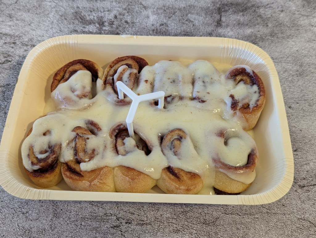 The ten mini rolls are nestled in their container and topped with the Cinnabon signature cream cheese frosting. The rolls are also topped with a plastic pizza saver to keep the lid from stealing any of that amazing frosting. A nice touch and much appreciated.