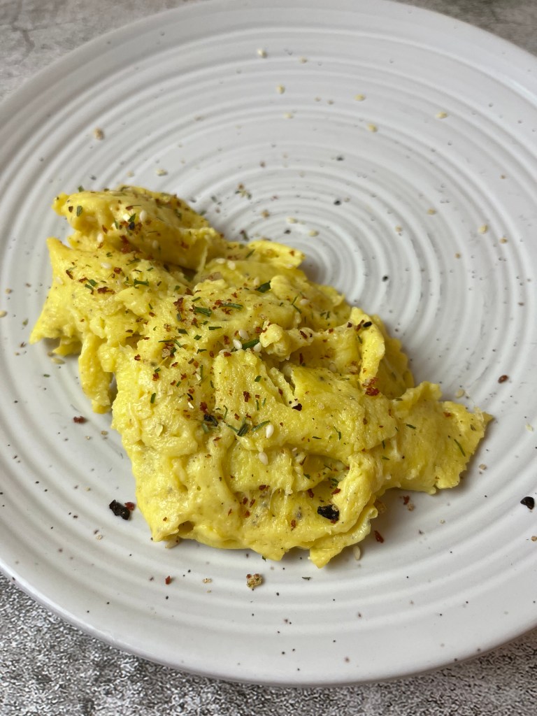 I decided to try the Egg Topper this morning. When I peeled off the foil seal the pleasant scent of onion greeted me. The recommendation is that the spice blend should be used as a topping so I grabbed a pinch and sprinkled it over the scrambled eggs.