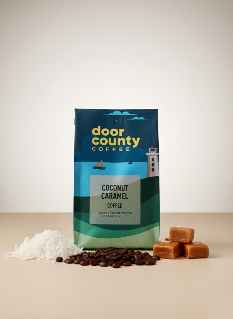 I was on a recent supply run, tossing my usual pantry heroes into the cart, when my eye snagged on a bright bag from a highly reliable regional favorite: Door County Coffee Roasters’ Coconut Caramel blend.