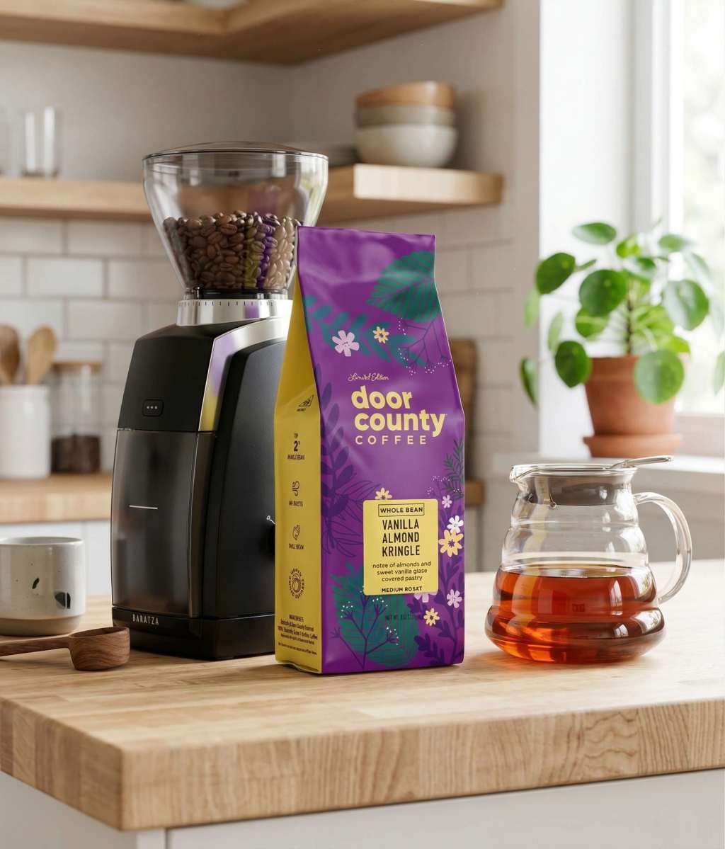 Last week, while browsing for my next morning ritual, a splash of vibrant, modern packaging caught my eye. Door County Coffee has always been a staple for me, I trust their base beans, but their new branding is a total vibe. It’s sleek, eye-catching, and feels premium before you even crack the seal. Among the spring and summer seasonal offerings sat the Vanilla Almond Kringle.